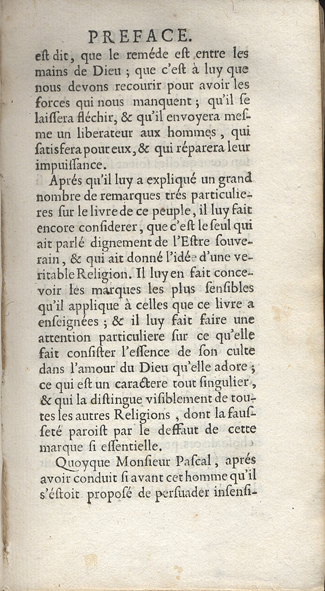 est dit, que le remède est entre les mains de Dieu ; que c’est à lui que nous devons recourir pour avoir les forces qui nous manquent ; qu’il se laissera fléchir, et qu’il enverra même un libérateur aux hommes, qui satisfera pour eux, et qui réparera leur impuissance. Après qu’il lui a expliqué un grand nombre de remarques très particulières sur le livre de ce peuple, il lui fait encore considérer, que c’est le seul qui ait parlé dignement de l’Être souverain, et qui ait donné l’idée d’une véritable Religion. Il lui en fait concevoir les marques les plus sensibles qu’il applique à celles que ce livre a enseignées ; et il lui fait faire une attention particulière sur ce qu’elle fait consister l’essence de son culte dans l’amour du Dieu qu’elle adore ; ce qui est un caractère tout singulier, et qui la distingue visiblement de toutes les autres Religions, dont la fausseté paraît par le défaut de cette marque si essentielle. Quoique Monsieur Pascal, après avoir conduit si avant cet homme qu’il s’était proposé de persuader insensiblement, |