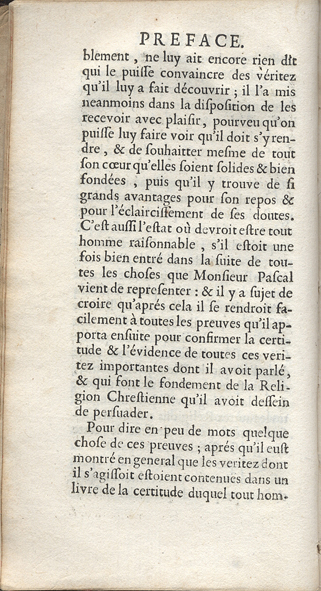 ne lui ait encore rien dit qui le puisse convaincre des vérités qu’il lui a fait découvrir ; il l’a mis néanmoins dans la disposition de les recevoir avec plaisir, pourvu qu’on puisse lui faire voir qu’il doit s’y rendre, et de souhaiter même de tout son cœur qu’elles soient solides et bien fondées, puisqu’il y trouve de si grands avantages pour son repos et pour l’éclaircissement de ses doutes. C’est aussi l’état où devrait être tout homme raisonnable, s’il était une fois bien entré dans la suite de toutes les choses que Monsieur Pascal vient de représenter : et il y a sujet de croire qu’après cela il se rendrait facilement à toutes les preuves qu’il apporta ensuite pour confirmer la certitude et l’évidence de toutes ces vérités importantes dont il avait parlé, et qui font le fondement de la Religion Chrétienne qu’il avait dessein de persuader. Pour dire en peu de mots quelque chose de ces preuves ; après qu’il eût montré en général que les vérités dont il s’agissait étaient contenues dans un livre de la certitude duquel tout homme |