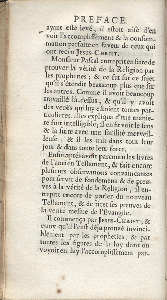 ayant été levé, il était aisé d’en voir l’accomplissement et la consommation parfaite en faveur de ceux qui ont reçu Jésus-Christ. Monsieur Pascal entreprit ensuite de prouver la vérité de la Religion par les prophéties ; et ce fut sur ce sujet qu’il s’étendit beaucoup plus que sur les autres. Comme il avait beaucoup travaillé là-dessus, et qu’il y avait des vues qui lui étaient toutes particulières, il les expliqua d’une manière fort intelligible ; il en fit voir le sens et la suite avec une facilité merveilleuse ; et il les mit dans tout leur jour et dans toute leur force. Enfin après avoir parcouru les livres de l’ancien Testament, et fait encore plusieurs observations convaincantes pour servir de fondements et de preuves à la vérité de la Religion, il entreprit encore de parler du nouveau Testament, et de tirer ses preuves de la vérité même de l’Évangile. Il commença par Jésus-Christ ; et quoiqu’il l’eût déjà prouvé invinciblement par les prophéties, et par toutes les figures de la loi dont on voyait en lui l’accomplissement parfait, |