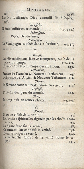 T. Temps. Les divertissements faux et trompeurs, cause de la Le présent est le seul temps qui est à nous. 249. Testament. Preuve de l’Ancien et Nouveau Testament. 95. Différence de l’Ancien et Nouveau Testament. 112. Tenter. Différence entre tenter et induire en erreur. 219. Tristesse. Tristesse des gens du monde. 247. Trop. Le trop nuit en toutes choses. 172. 173.